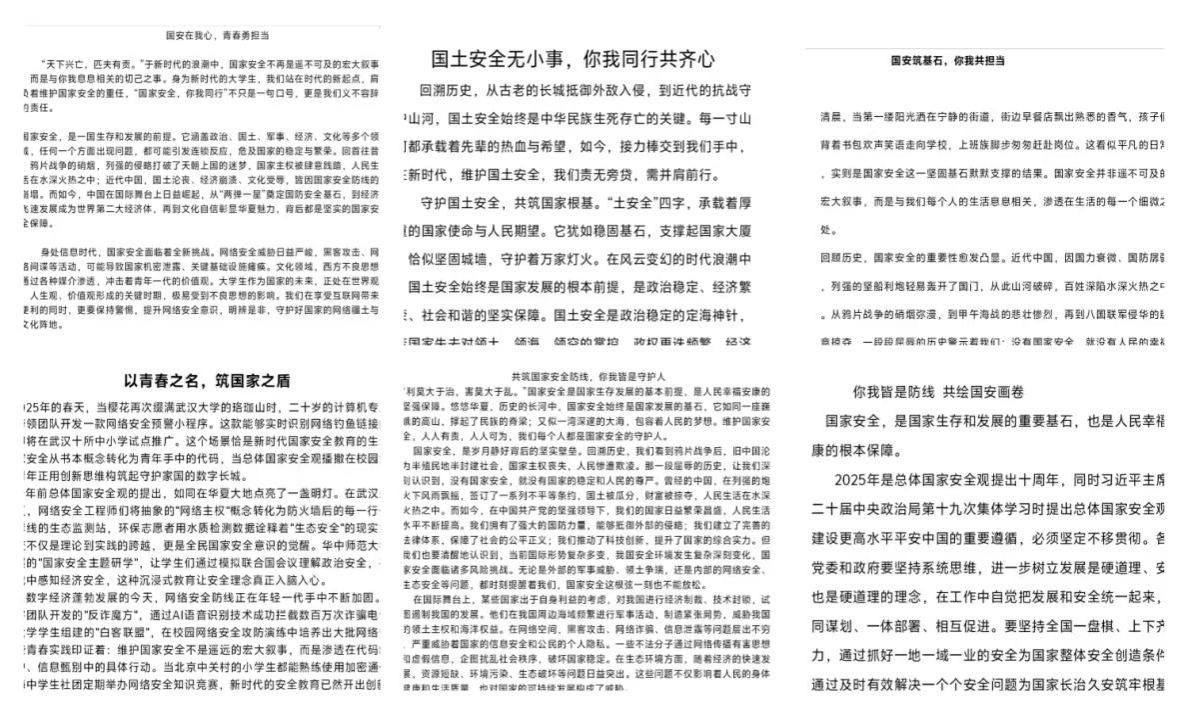公司举办了“国家安全,你我同行”征文活动,鼓励员工们结合自身学习和生活实际,抒发对国家安全的认识和感悟。活动得到了广老员工的积极响应,共收到征文30余篇。员工从不同角度阐述了对国家安全的理解,有的同学聚焦康复领域的生物安全,探讨在医疗过程中,如何防止病菌传播、保障患者和医护人员的健康安全;有的同学则着眼于文化安全,强调在医学文化传承与交流中,要坚守本土优秀文化,防止文化入侵。经公司专业教师的认真评选,共评选出6篇优秀征文,进一步扩大了活动的影响力,激发了员工们维护国家安全的热情。